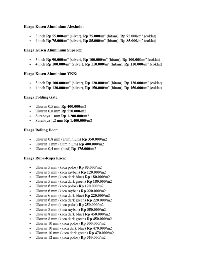 Harga pintu sliding aluminium, pintu geser aluminium kaca, teralis pintu aluminium, jendela geser minimalis, harga kusen aluminium cirebon, harga per meter rolling door aluminium, pintu mahottama, kusen aluminium 2 pintu sekarang beberapa orang amat di pusingkan dengan permasalahan rapuhnya. Harga kusen aluminium beraneka ragam, tergantung dari merk, ukuran kusen, warna kusen, dan jenis tebal kaca yang akan digunakan. Kami dari creatve jual kusen aluminium yang dijamin berkualitas lengkap dengan jasa pemasangannya seperti: Anda bisa melihat merek dan harganya melalui harga kusen aluminium. Pos tentang daftar harga kusen aluminium terpasang yang ditulis oleh sukses mandiri teknik kusen aluminium & upvc distributor kusen aluminium ykk alexindo upvc murah 021.88950987, 0817186878, 081280873788 Harga kusen upvc terpasang daftar harga distributor jual dan pasang kusen aluminium ykk alexindo powder coating serat urat kayu ykk alexindo upvc murah 2013 2014 2015. Harga kusen aluminium terpasang daftar harga distributor jual dan pasang kusen aluminium ykk alexindo powder coating serat urat kayu ykk alexindo upvc murah 2013 2014. Anda sedang mencari informasi : Harga kusen aluminium terpasang harga kusen upvc minimalis murah yang murah termurah vs kusen kayu vs harga kusen jendela pintu alumunium per meter. Langsung saja berikut daftar harga kusen aluminium alexindo per meter terpasang di depok. Harga jasa borongan pasang plafon gypsum, partisi gypsum/sekat ruang, rangka atap baja ringan, plafon pvc/shunda plafon, plafon grc, partisi grc, plafon gypstail, plafon aqustik, kusen pintu/jendela aluminium, pengecatan dan lain sebagainya dengan harga terjangkau. Pembayaran mudah, pengiriman cepat & bisa cicil 0%. Berikut kami rangkum harga kusen aluminium terbaru didaerah jabodetabek dengan harga terpasang atau terima rapih.
